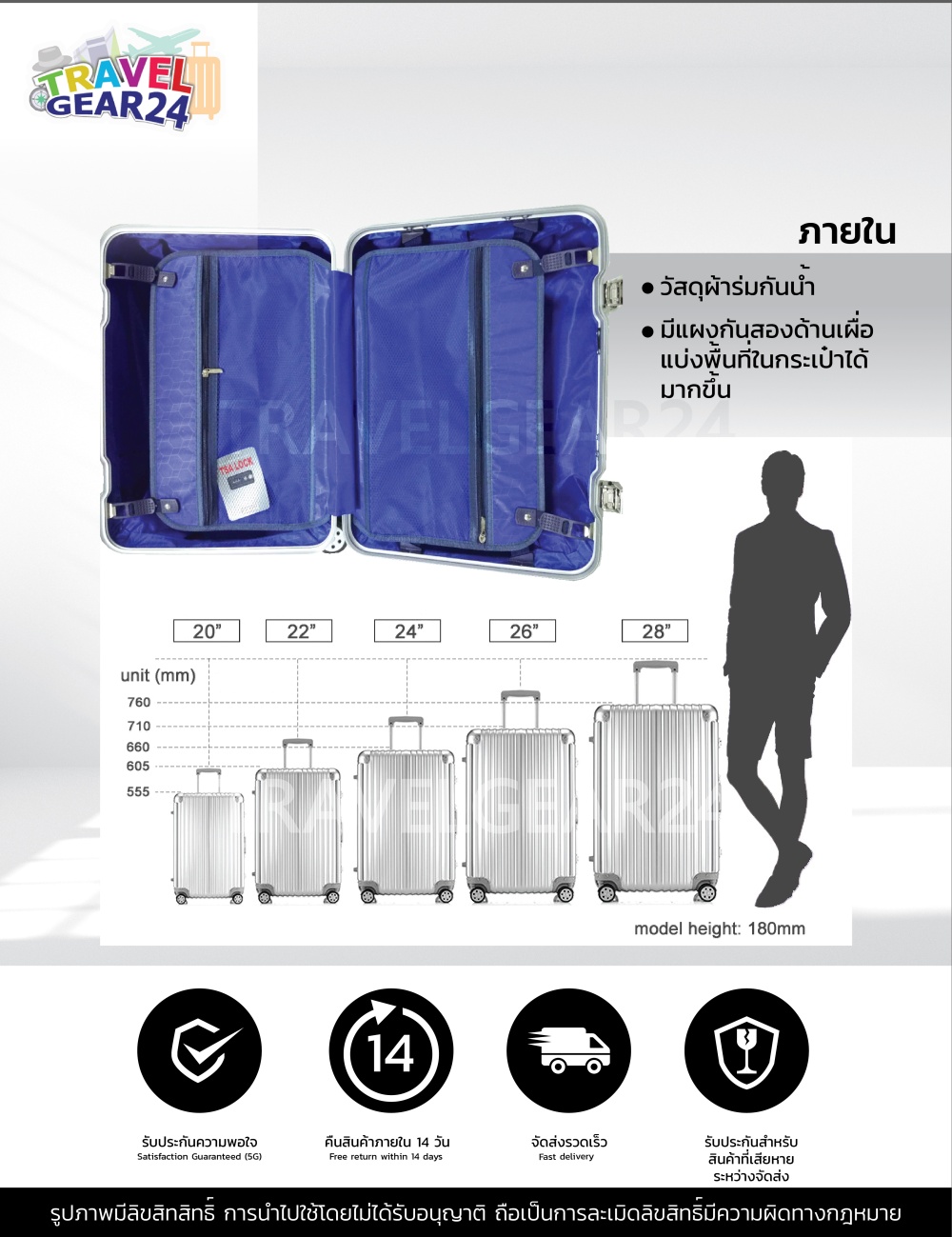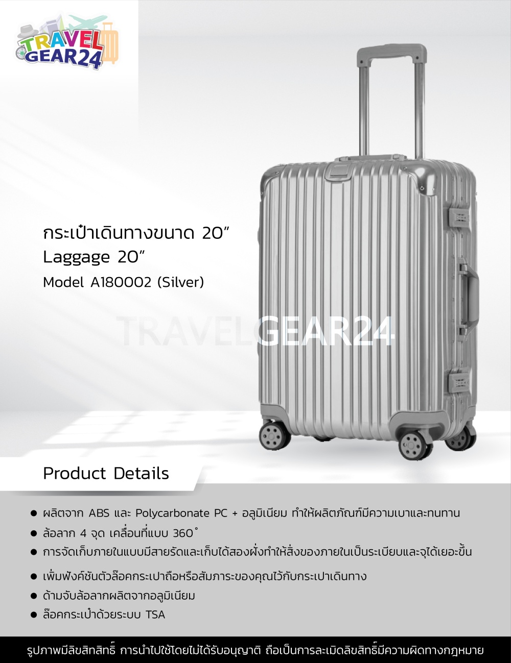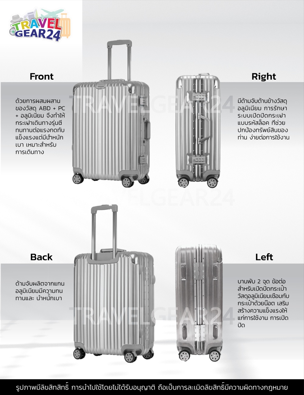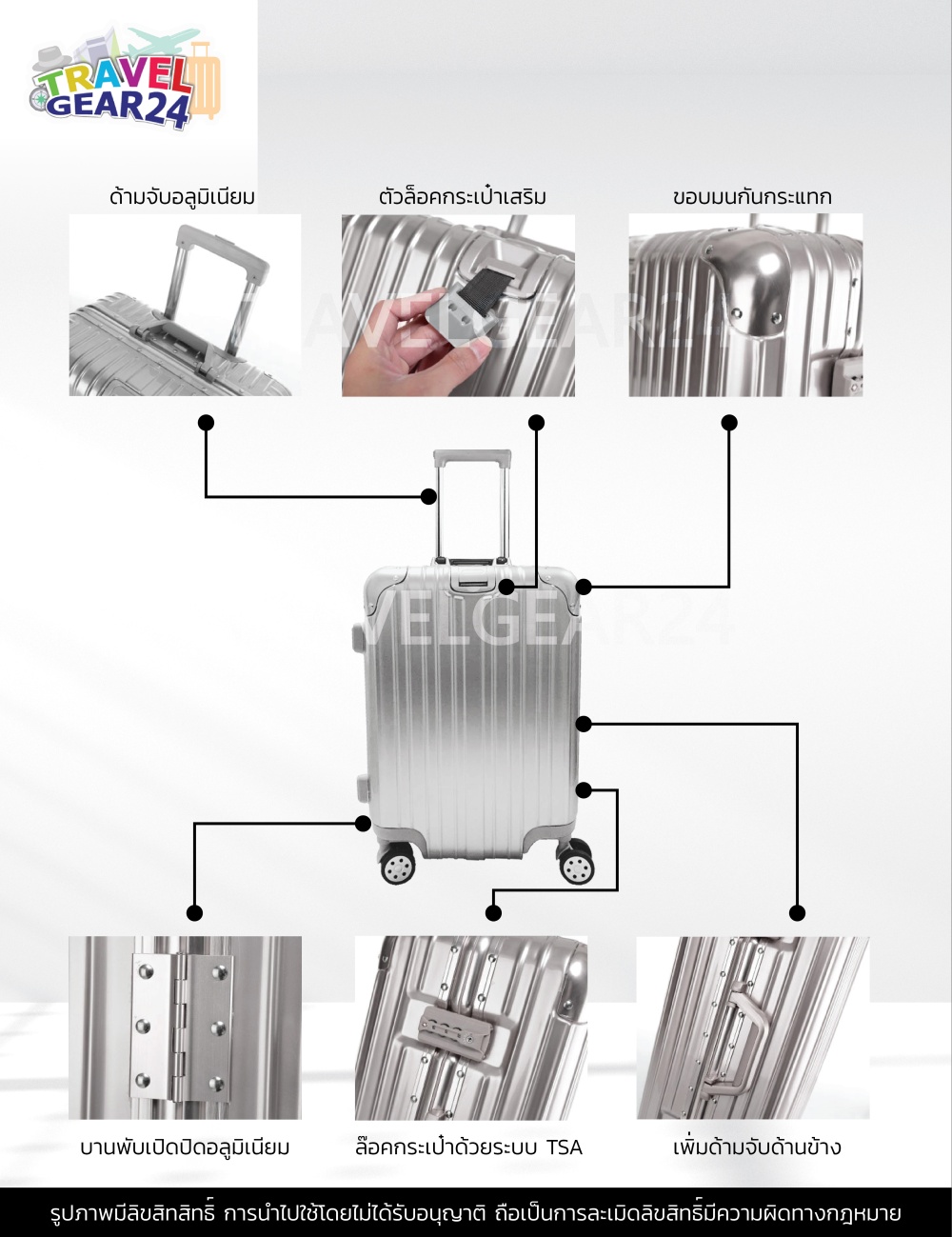 ภาพประกอบสินค้า TravelGear24 กระเป๋าเดินทางขนาด 20 นิ้ว โครงอลูมิเนียม อลูมิเนียม วัสดุ ABS+PC - Model A1800 (Silver/สีเงิน)